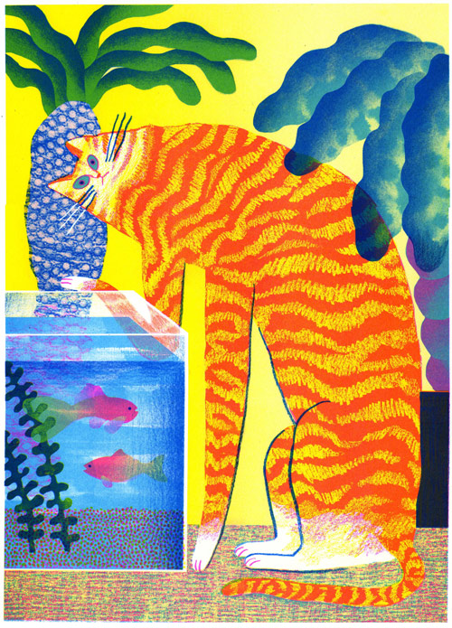 She describes her recent turn to printmaking as “amazing and very different to anything else,” and you can see exactly what she means. With etching plates and drypoint needles, she scratches not just images but moods—diamond-shaped figures holding potted plants, bulbous creatures devouring peers, scenes half familiar, half uncanny. The lines are sharp. The textures are rich. These aren’t flat illustrations; they feel like layered thoughts you can almost trace with your fingertip.