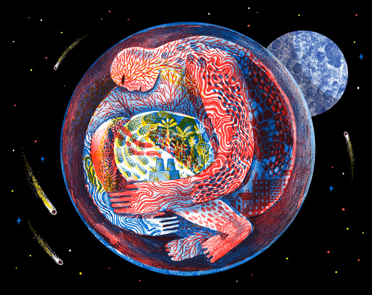 Her characters often appear paused in mid-motion, or mid-metamorphosis. One piece might show a figure whose head blooms into foliage, another where the body is a constellation of textures, color and line. They’re metaphorical but lived-in. They reflect Yoon’s interest in identity, transformation, and the quiet power of craft. She once noted that using etching felt counterintuitive, but thrilling—the “scratched” image carries its own ghost of the process. You can see the tool’s trace, the pull of ink, the press of paper.