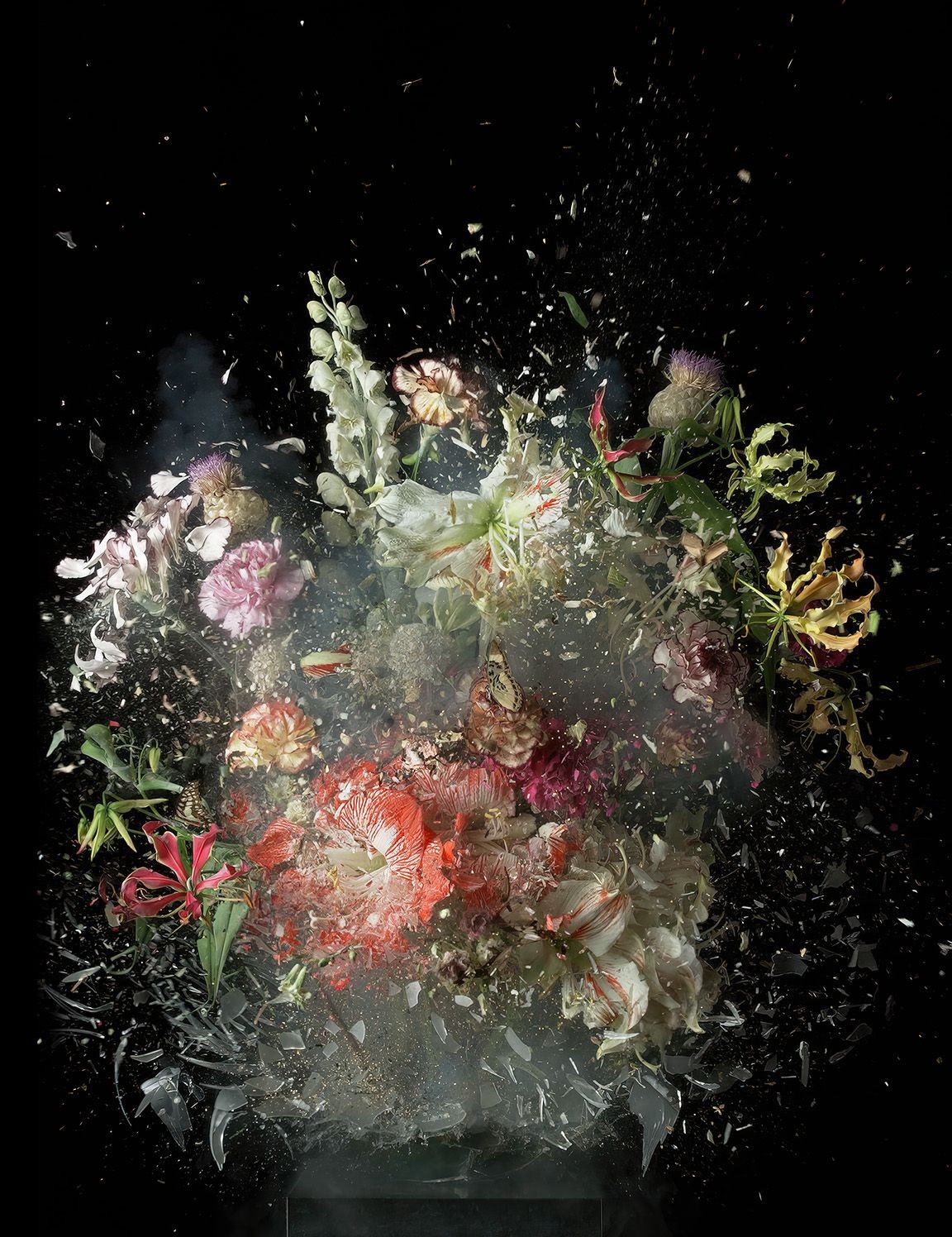 What marks Gersht’s work most strikingly is his dialogue with still life — a genre with deep roots in art history, traditionally associated with calm compositions, symbolic fruit and flowers, and reflections on mortality. He subverts this heritage by introducing moments of rupture and transformation. In series like Blow Up, ornate floral arrangements lie poised only to be shattered by controlled explosions, captured in high-speed photography that freezes the split-second of destruction. The resulting images are both visually sumptuous and viscerally disquieting — a reminder that beauty and violence can be inseparable.