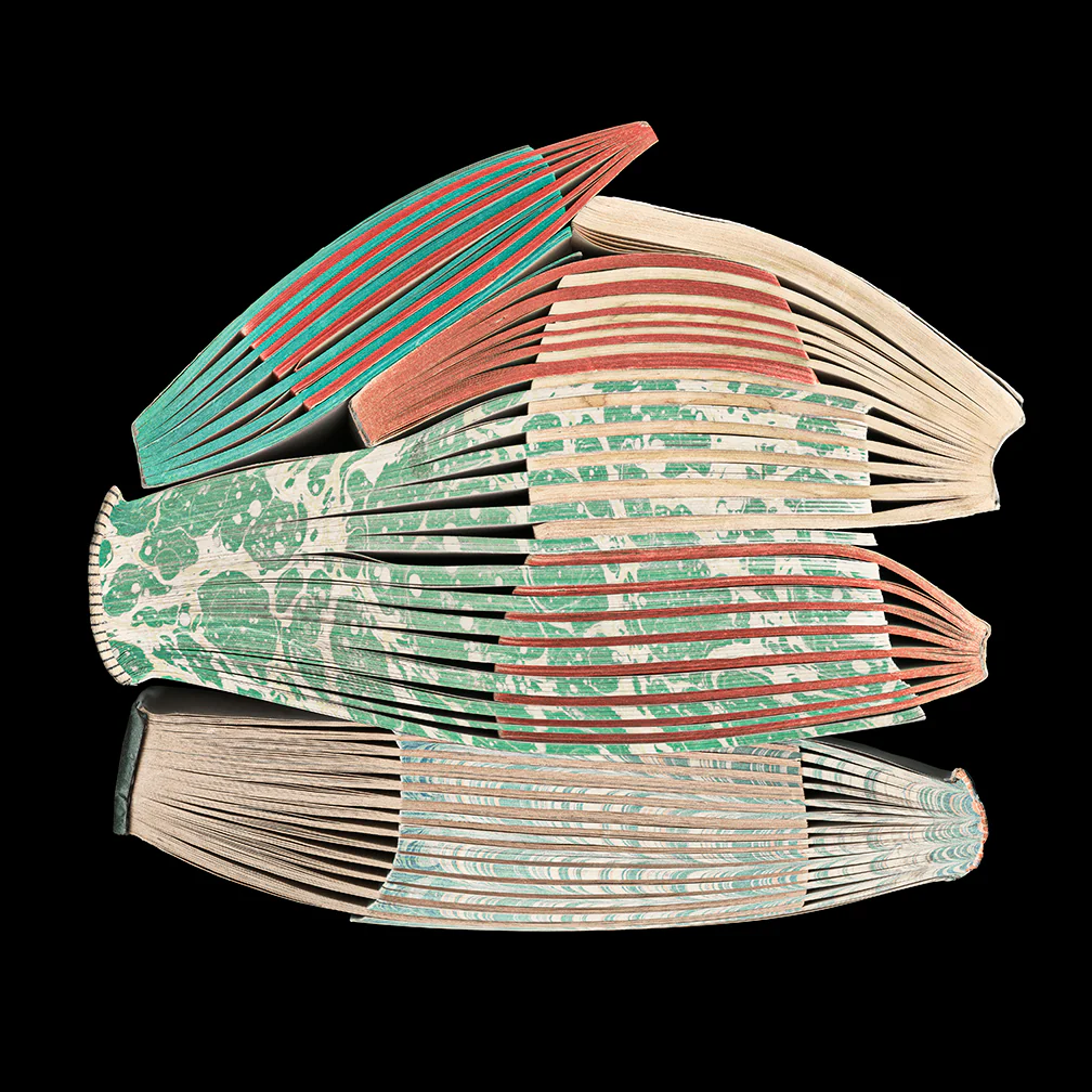 Barer’s process begins long before the camera, with her hands and stacks of obsolete printed materials. She soaks, folds, dyes, and compresses discarded books and paper, transforming them into sculptural forms that challenge the idea of books as fixed vessels of knowledge. Each volume becomes fragile and fluid, reflecting her ongoing concern with how information can erode in a world increasingly dependent on digital systems. Photography then preserves these temporary forms, capturing a precise moment of physical and conceptual transformation.