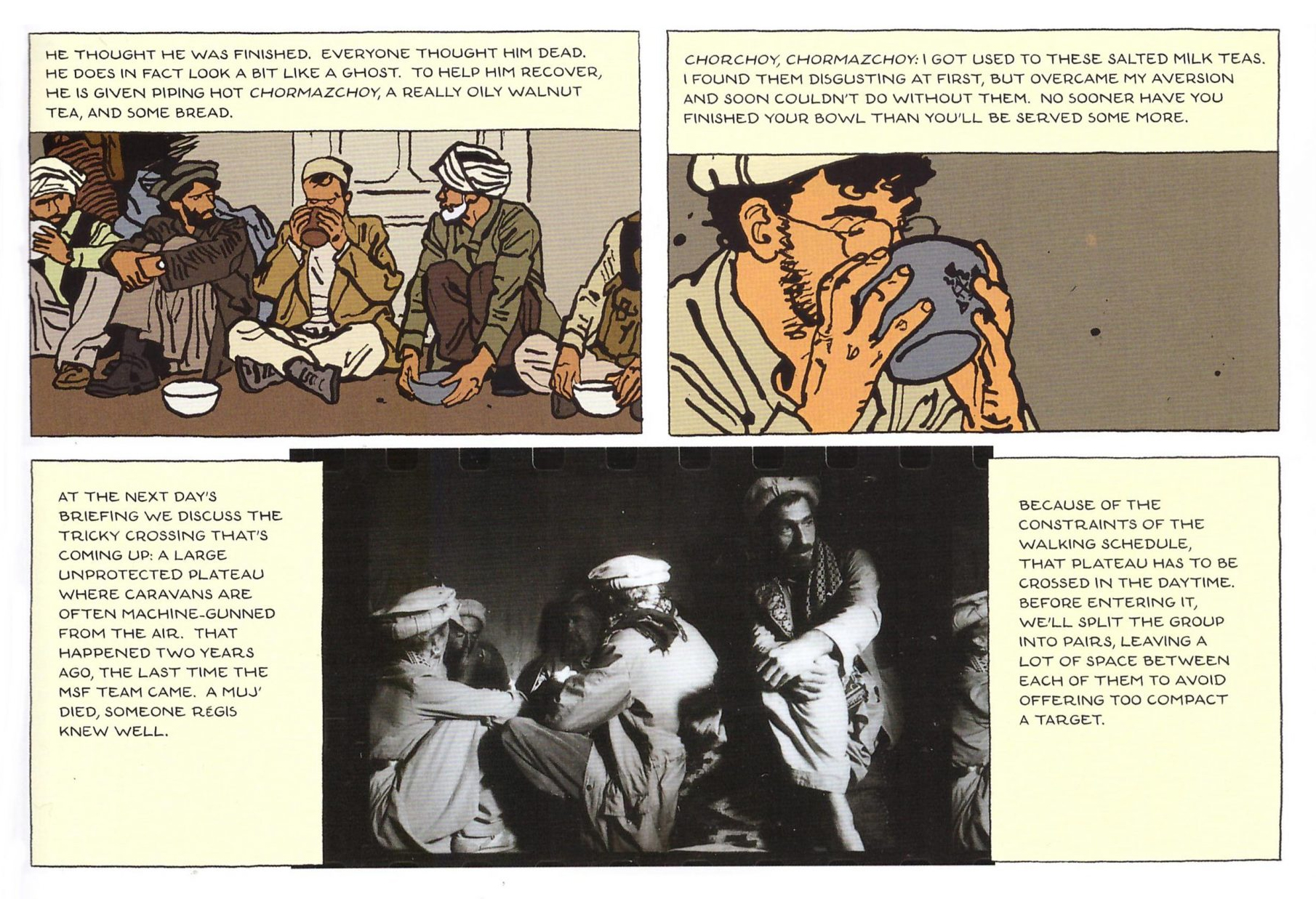 The book works through an unusual collaboration: Lefèvre’s photographs, Emmanuel Guibert’s drawings, and Frédéric Lemercier’s careful design merge into a single narrative rhythm. Illustrated passages guide us through conversations, fatigue, humor, and the small logistics of survival. Then the photographs arrive — raw, immediate, undeniable — grounding every page in lived reality. The shift between drawing and photography feels almost like memory itself: sometimes reconstructed, sometimes painfully clear.