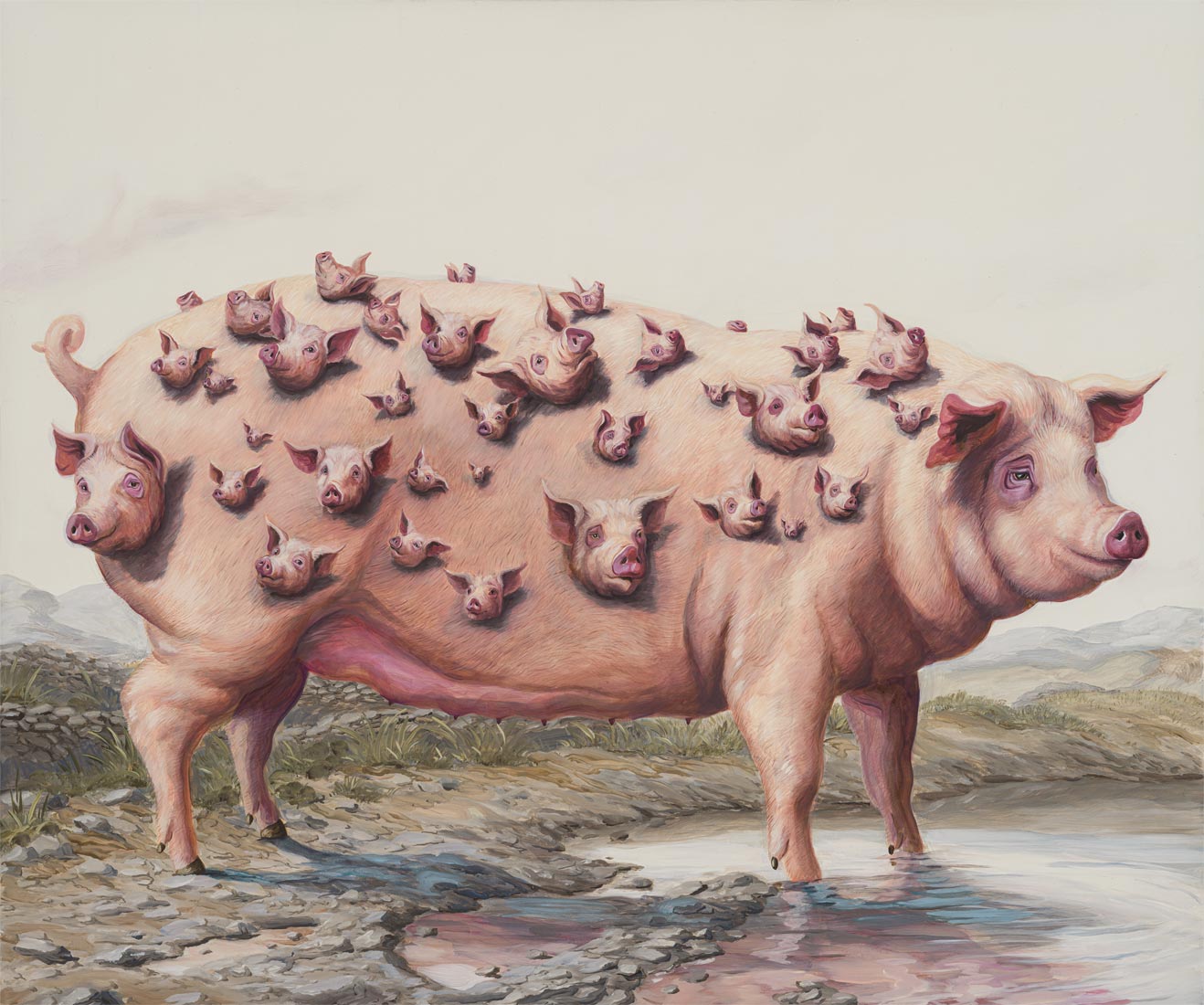There’s something disorienting about the paintings of Bruno Pontiroli. At first glance they appear grounded in a familiar visual language: carefully rendered figures, animals painted with anatomical precision, landscapes that feel convincingly real. But spend a few seconds longer inside the scene and the world begins to tilt. Bodies stretch beyond natural limits, gravity loses its authority, and animals and humans share a strange, joyful coexistence that feels both absurd and oddly harmonious.